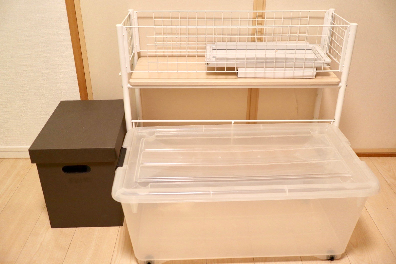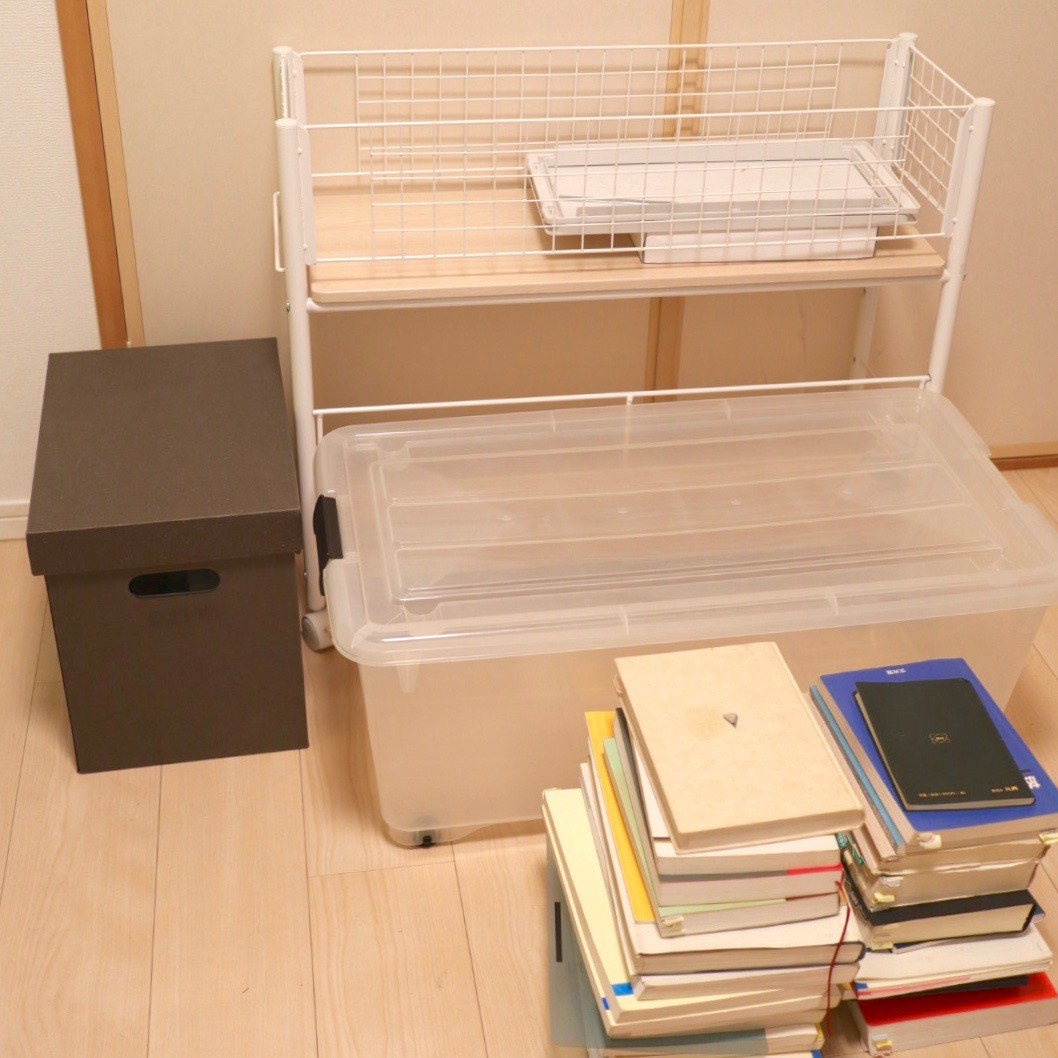 他には衣装ケース(取っ手壊れてる)、段ボール収納とか。