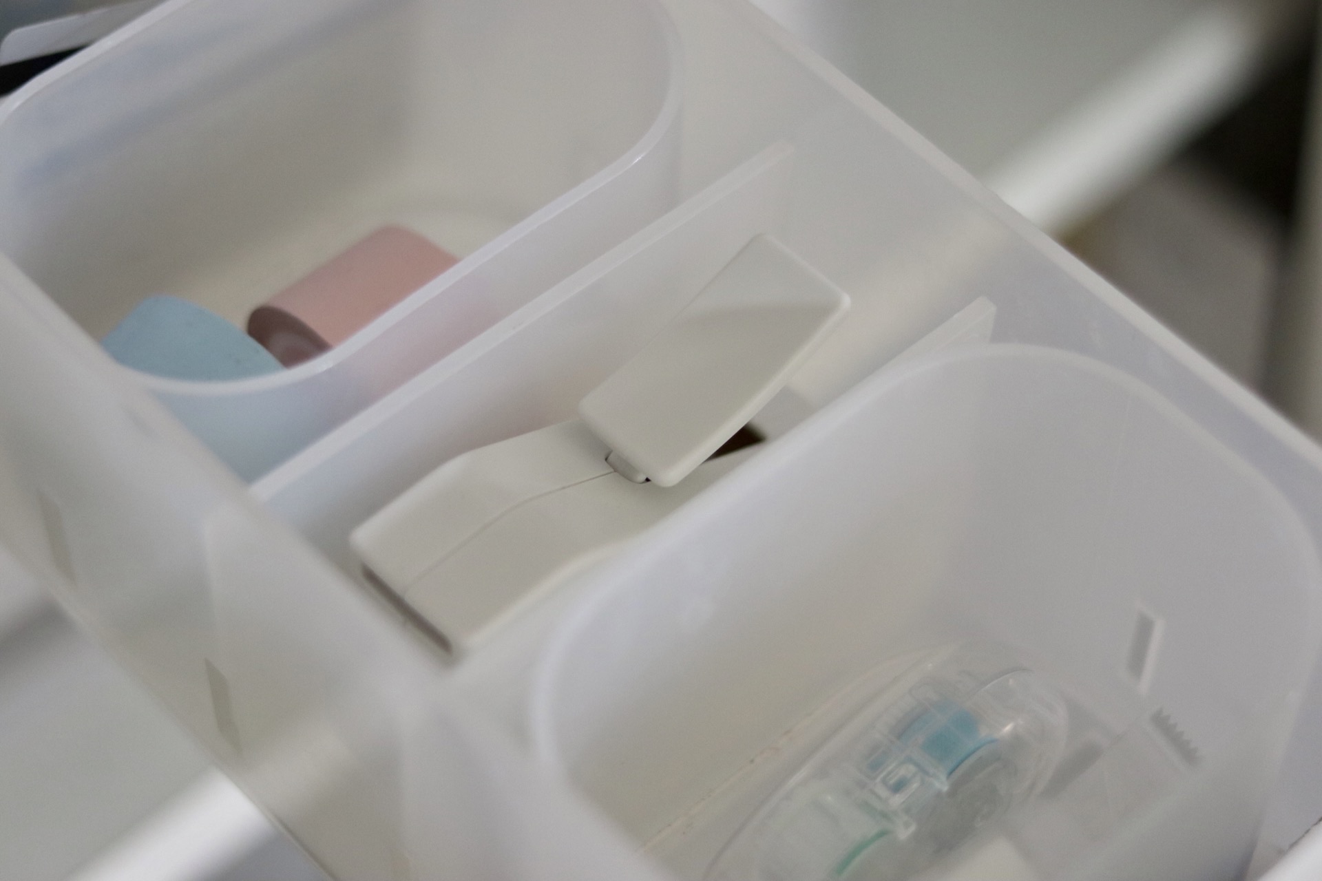 文具を入れてるケースは無印のPPケース・6仕切りタイプです。