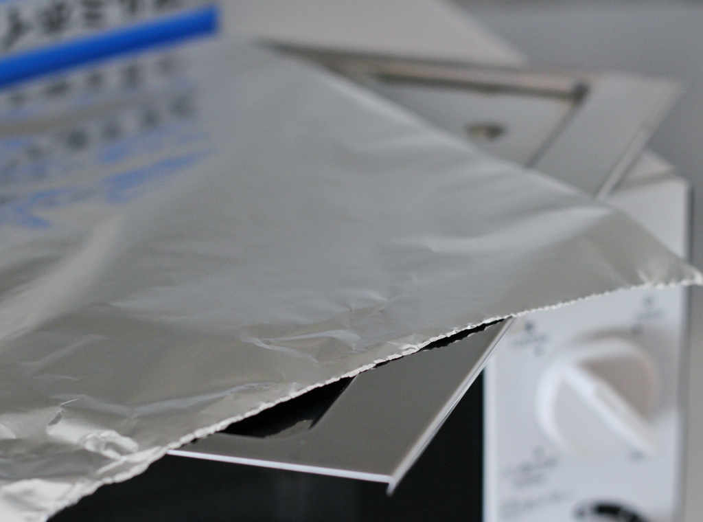 受け皿にアルミホイルを敷いて、できるだけピッタリ密着させます!