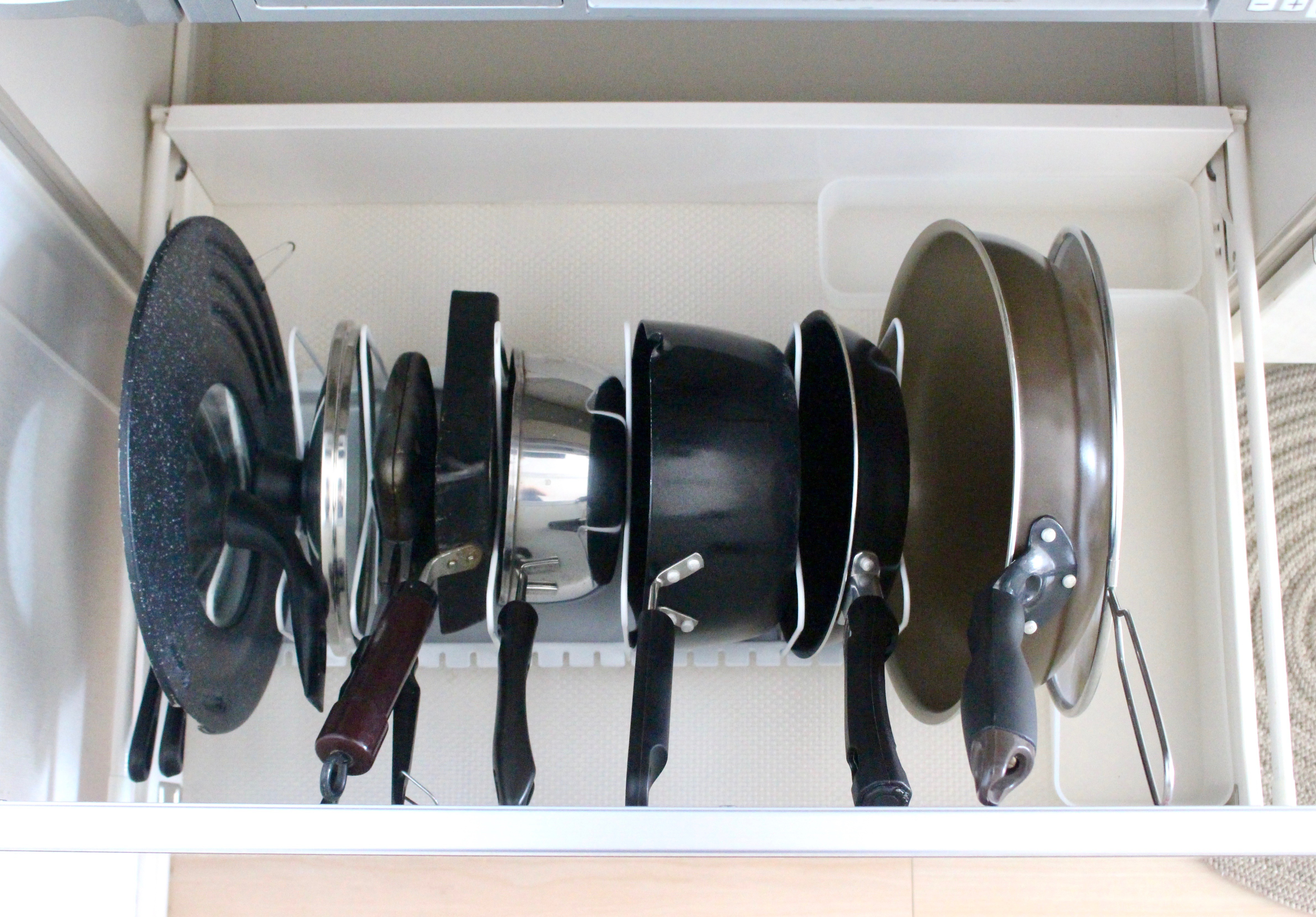 以前はIKEAのビヨーンと伸びるのを使ってたんですが、1つずつの調節ができないのでフライパンが倒れたり・・・。