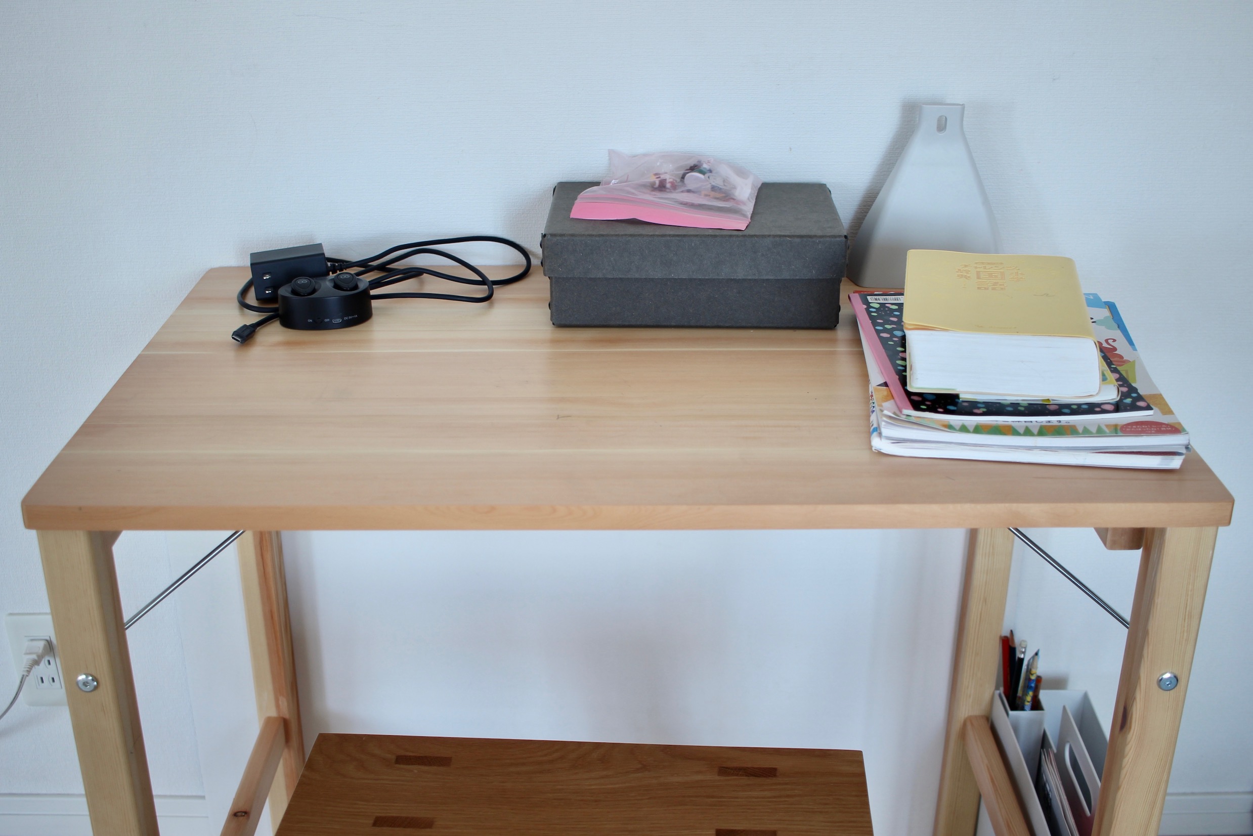 イヤホン、コード(主人)、辞書やノート(子供たち)、箱(私)