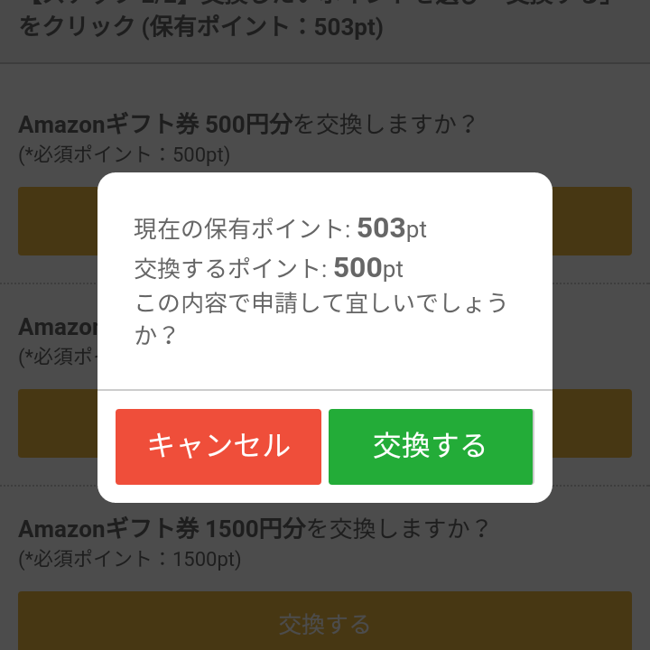 やっとアマゾンのギフト券500円分に交換できました。