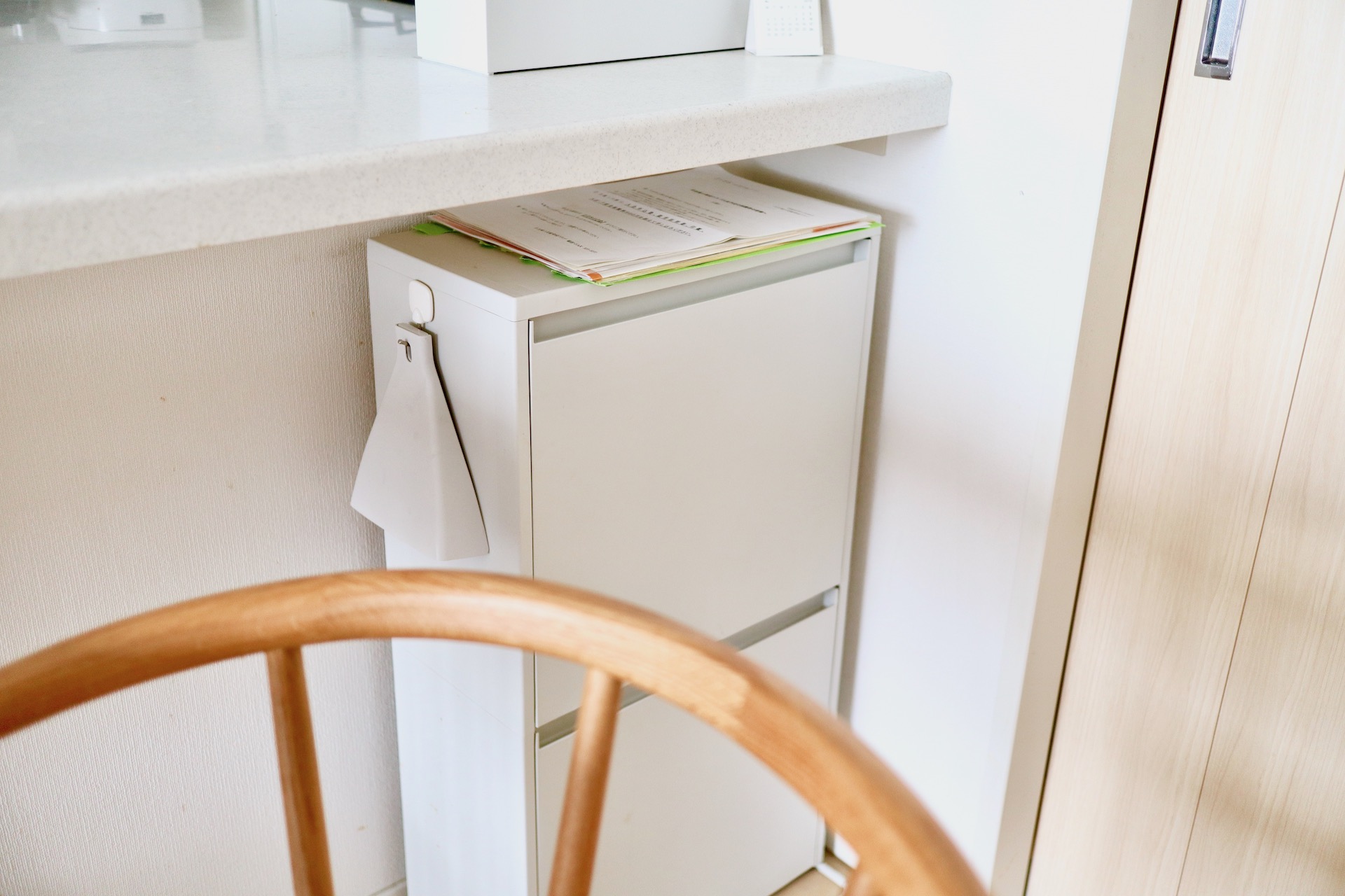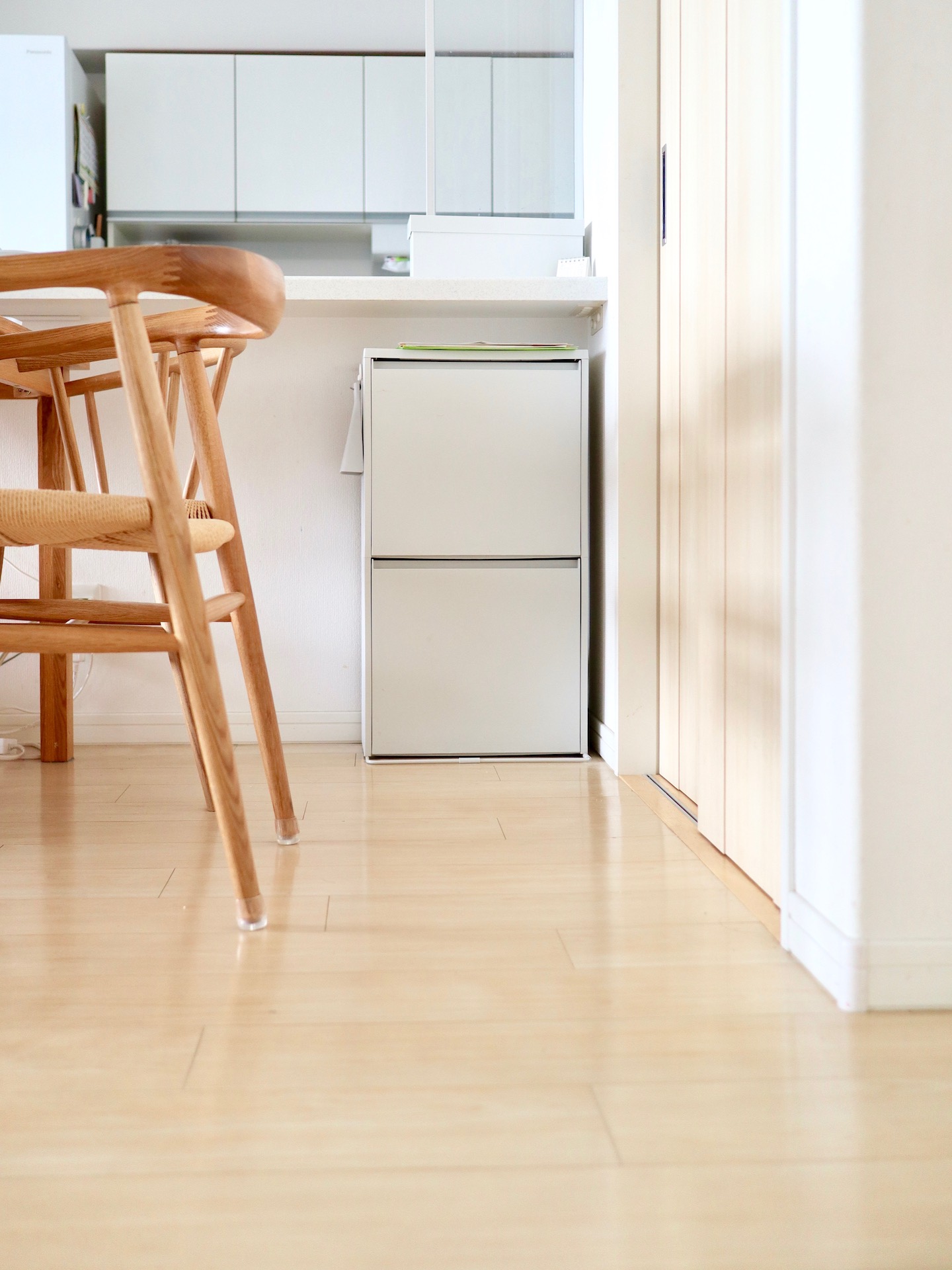 ダイニング横・カウンター下にひっそりと置いてる無印の二段ケース。