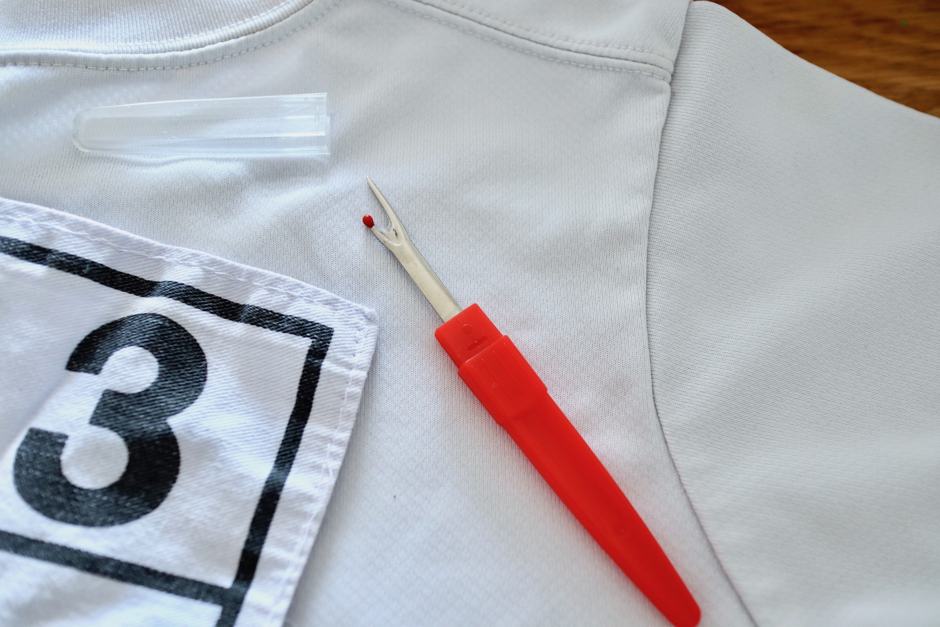 まず、100均で買った「リッパー」を使って古いゼッケンを外す!