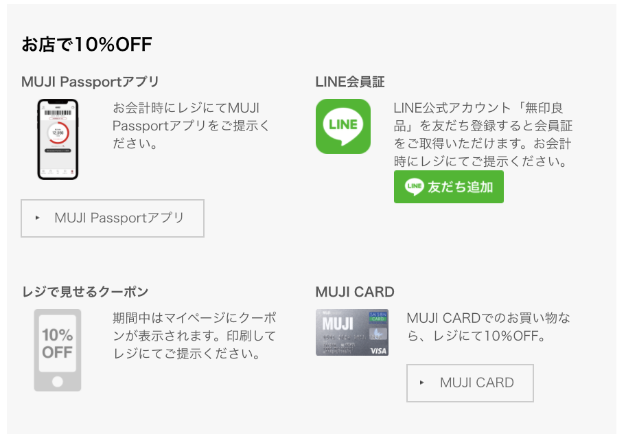 期間中、MUJI passport やクーポンメールの提示で10%OFF、ネットストアでのお買い物も10%OFFです。